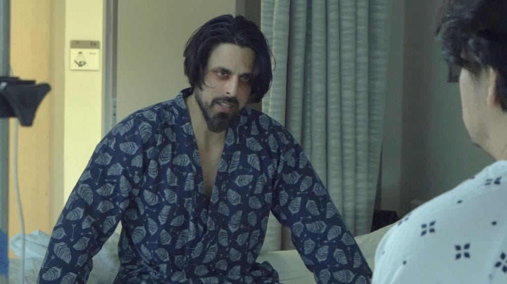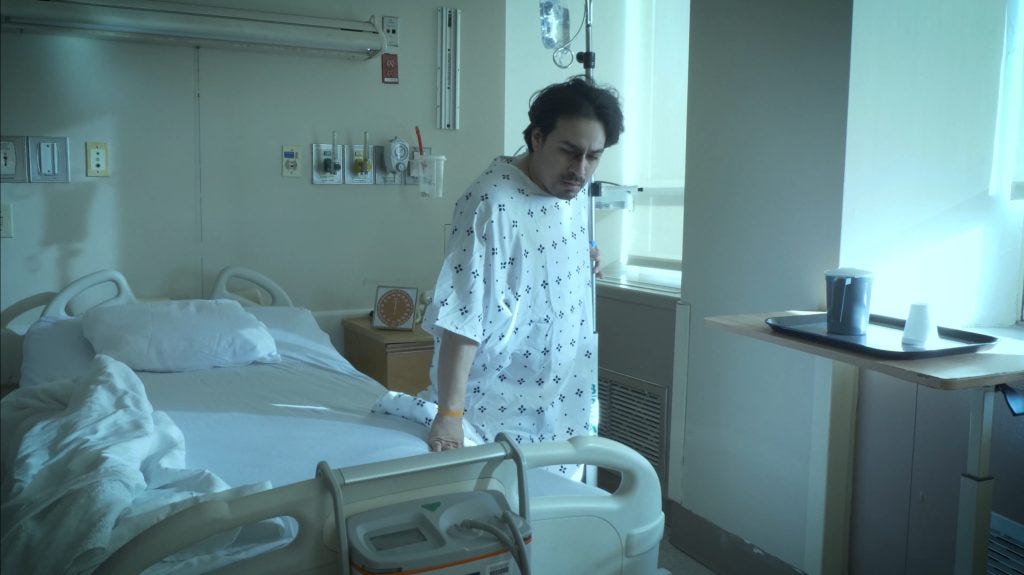In I Exist, a 15 minute short which is Martin del Carpio’s latest existential, allegorical narrative, Jordan Martinez (Giovanni Sandaval) wakes up in a hospital room with a black eye, not quite sure how he got there, other than his own tendency to “take things too far.” He has a philosophical conversation with another patient in his shared room, a portentous and intimidating man (Alan Tavaraz) who’s odd manner implies he may be Jordan’s hallucination. Their talk consists of commonplace observations about the difference between merely “existing” and really “living.” Jordan, it seems, suffers from an inner emptiness, despite his successful job and marriage. He once had unnamed dreams and ambitions for self-fulfillment in his youth, but he let them pass by.