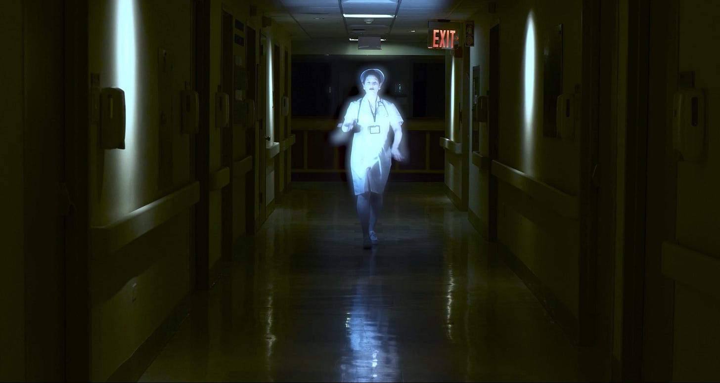 In Jordan’s talk with his roommate he complains that his life has been reduced to merely “existing,” but it becomes increasingly unclear if he or anything around him has a solid existence. Both roommate and nurse have vanished. He wanders around the empty hospital floor, terrified, the hall lights shorting out, while he himself seems to flicker in and out of existence. Stumbling into a room marked “No Exit,” he seems trapped in a Bardo state, neither dead nor alive. Through the window, even the city outside is devoid of inhabitants, as everything dissolves into a blinding white light.